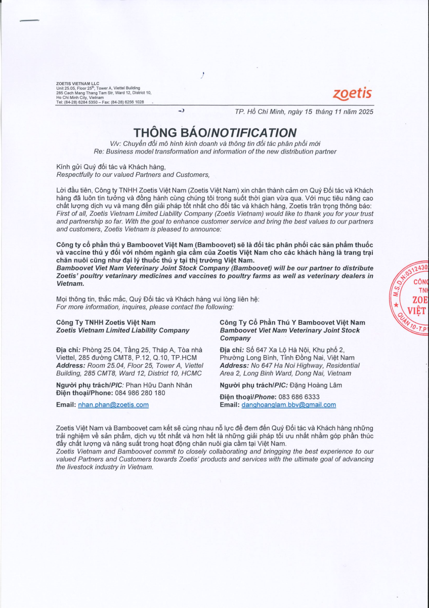Kể từ ngày 15/11/2025, Bamboovet chính thức trở thành đối tác phân phối các sản phẩm thuốc và vaccine thú y cho nhóm ngành gia cầm của Zoetis Việt Nam trên thị trường Việt Nam.